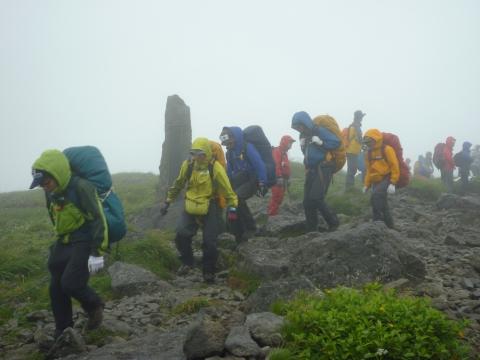 7/31 月山山頂を出発するところ・風が強く寒い中の行動でした