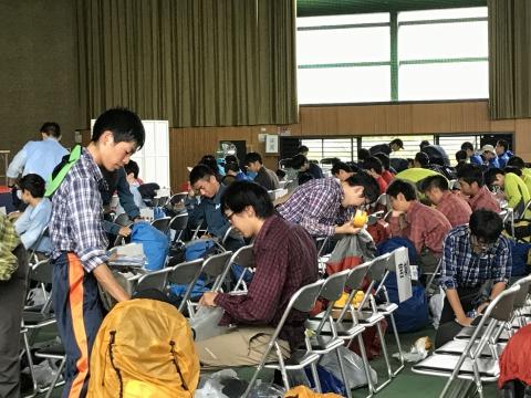 8/1 瀧山コース下山後の装備審査・悪天のため体育館で実施