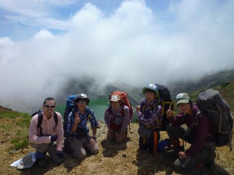 行動最終日は努力したご褒美かのように、熊野岳から馬の背を越えてゴール地点に歩くうちに、青空の下、ガスの合間から御釜が姿を現し始め、そのエメラルドグリーンの神秘的な水面を全国のチームとともに堪能できました。山形の大会でしたが、宮城県としても協力できた気分でした。
