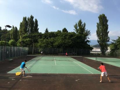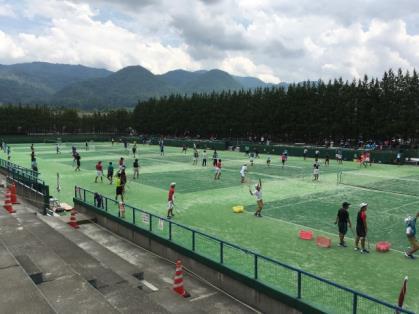 ソフトテニス競技の開会式が行われる7月22日に先立ち,前日から会津若松市へ移動しました。大舞台を前に,少しでも多くボールを触りたいという選手の要望に応えて,急遽,会津若松市内のテニスコートを借りて練習しました。補助員として同行した2名の生徒を加えて4人で,いかにも盆地の夏という灼熱の中で,滝のように汗を流しながら練習しました。