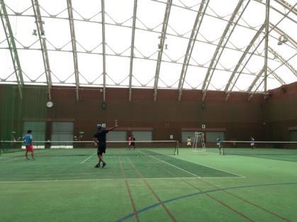 いよいよ試合開始。降っていた雨もちょうどやみました。選手は思ったほど緊張している様子もなく,いい動きでポイントを取る場面もありましたが,相手はほとんどミスをすることなく,コート深いところにボールを返してきます。