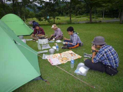 ●修業式のあった7月24日(火)午後学校を出発し、顧問の車3台に分乗して東北道を北上し、黒石市内で黒石つゆ焼そばの夕食をとり、酸ヶ湯温泉キャンプ場に入りました。出発時は晴れ間も見えたのに、青森に入ると雨がちになり、酸ヶ湯温泉は小雨でした。雨の中テントを設営し、寝るのは大変だと思っていたところ、優しい管理人さんが管理棟2Fの研修室を使ってもいいと言ってくれました。快適な夜を過ごすことが出来ました。