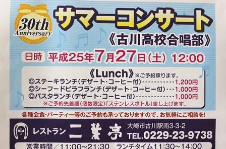一覧へ 合唱部、サマーコンサート開催します♪ 投稿日時: 2013/07/26 古川高校 大崎市内のレストラン『二葉亭』様において、サマーコンサートを開催いたします 開演は、12:50分頃です。 おいしいお食事と共に、ぜひ私達合唱部のコンサートをお楽しみください♪♪♪