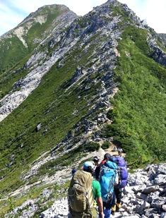 (8月3日10時頃、常念岳の岩場を登る) (8月3日12時頃、常念岳2,857 mに全員無事登頂)