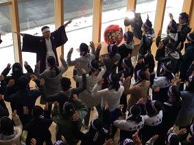続いて行われた応援団入会式。どん,どん,という太鼓の音に合わせて少しずつ入場してくる応援団,先輩方の目が覚めるような大きな声の校歌と図南歌を前に,本校の伝統の重さを改めて新入生は感じたのではないでしょうか。