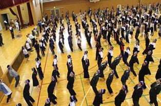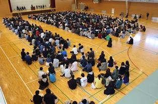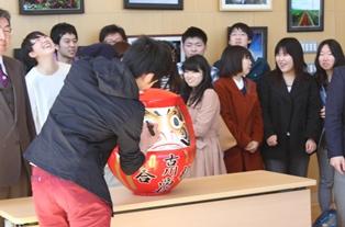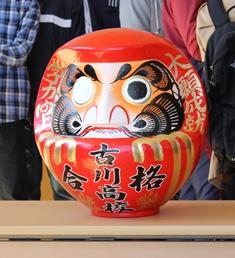 多目的ホールに集まり、感謝の意を込めてダルマの