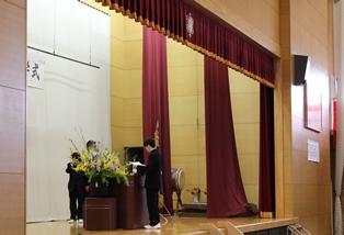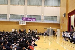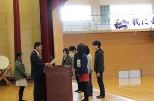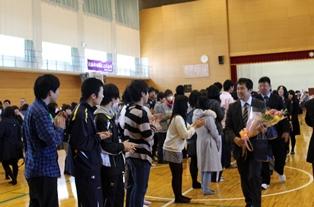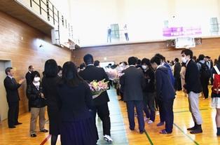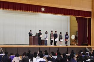 (生徒を代表し、生徒会長より挨拶) (PTAの皆様からの記念品と、生徒達から花束贈呈)