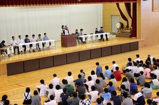 開催時間には雨天だったため、開会式は体育館にて行われました。