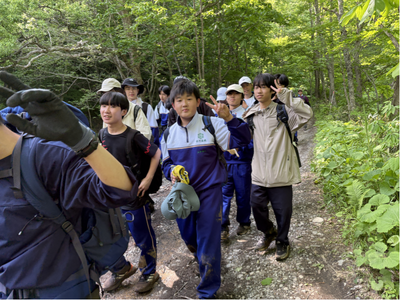 古川高校1年生恒例の船形山登山がありました。前日の雨もすっかり上がり絶好の登山日和となりました。大和町升沢にある旗坂野営キャンプ場(標高約500M)で開山式を行い、各クラスごと大崎耕土が一望できる三光の宮(標高約1200M)に向かって片道約2.5キロの道のりです。船形山はブナの原生林が生い茂る大自然、木の根っこが縦横無尽に伸び、自然に階段ができていました。ブナの落ち葉が一面に広がりふわふわとした感触、このブナの森が大崎耕土に豊かな水を注ぎ込むと同時に洪水を防ぐ貴重な仕組みになっています。地球温暖化といわれて久しい現在、至る所で大洪水や土砂崩れが発生しています。このブナの原生林が我々を守ってくれています。第二校歌といわれる「図南歌」の歌詞『船形おろし』を肌で感じ、充実した一日でした。往復5キロ、5時間もの登山、きつかったと思いますが、クラスみんなで励まし合い、明るく元気に戻ってきました。古高生の底力をここでも感じました。