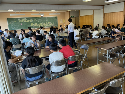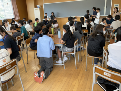 宮城県教育委員会から今年度も「発信型英語教育拠点校事業」の指定を受け、「地域連携」のスタートとして、本日(7月2日)古川第二小学校の6年生100名が来校し、合同授業を行いました。3つのクラスに分かれ、古高1・2年生の希望者82名が小学生の各グループに入って英語を教えました。