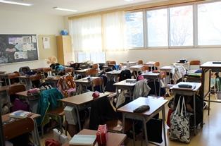 訓練地震発生アナウンス後、速やかに机の下へ避難。揺れ収束後に、体育館へ避難しました。