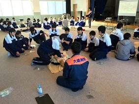 1月10日~18日の期間に,大崎消防署の方々の協力をいただき,心肺蘇生法について学びました。日替わりでクラスごとに,1年生全員が,胸骨圧迫,人工呼吸,AEDを全員が実際に体験しました。どのような状況の時に,どう対応すればよいのか,具体的に映像を見ながら分かりやすく説明していただきました。