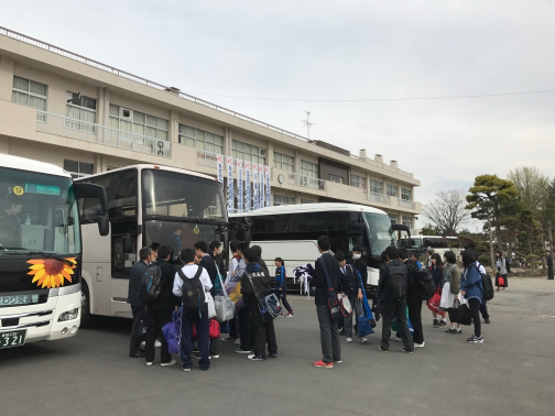 築館高校まで,全校生徒がバス18台に分乗して移動します。まさに大移動です。