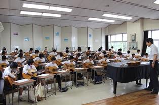 吹奏楽部による歓迎の演奏や、全体会が体育館で行われました。