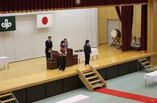 (生徒を代表し、生徒会長より挨拶) (PTAの皆様からの記念品と、生徒達から花束贈呈)