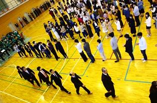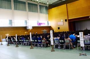 体育館においての全体会、各会場で物品購入、仮クラス教室で諸連絡等々が行われました。